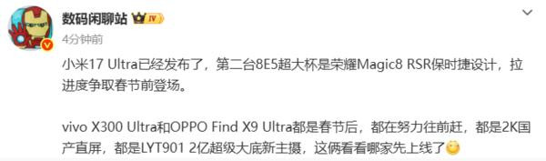 【CNMO科技消息】随着小米17 Ultra在圣诞夜登场,安卓阵营新一轮顶级旗舰的发布序幕正式拉开。12月26日,博主“数码闲聊站”曝光了荣耀、vivo、OPPO三家的“超大杯”年度影像旗舰机型发布时间线。根据爆料,荣耀Magic8 RSR保时捷设计将力争在春节前亮相,而vivo X300 Ultra和OPPO Find X9 Ultra则紧随其后,均计划于春节后发布。