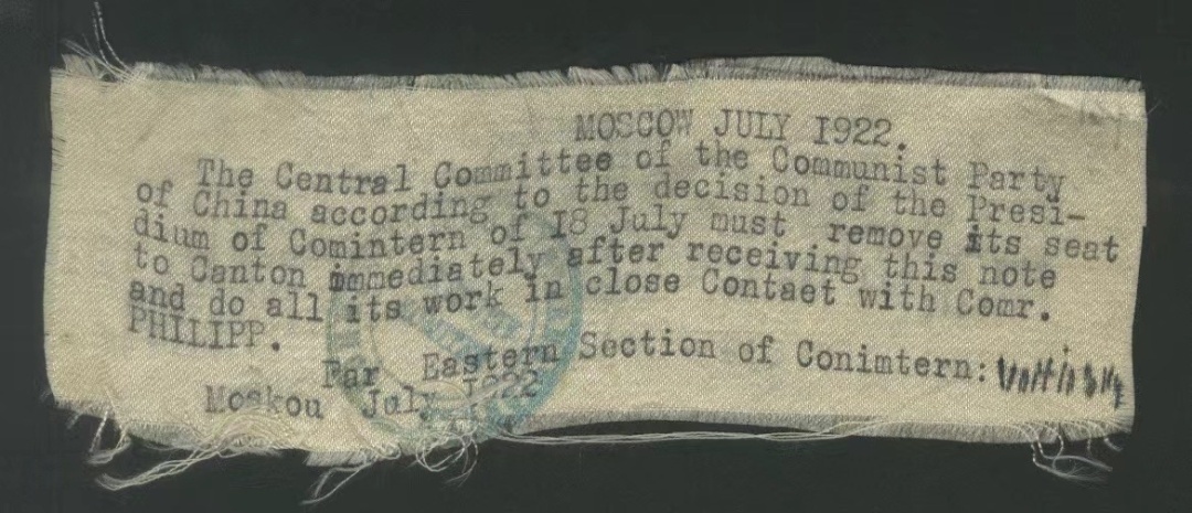 指令的内容翻译成中文为:“中国共产党中央委员会接短笺后,应据共产国际主席团7月18日决定,立即将驻地迁往广州并与菲力浦同志密切配合进行党的一切工作。共产国际远东支部,莫斯科,1922年7月,魏金斯基。”